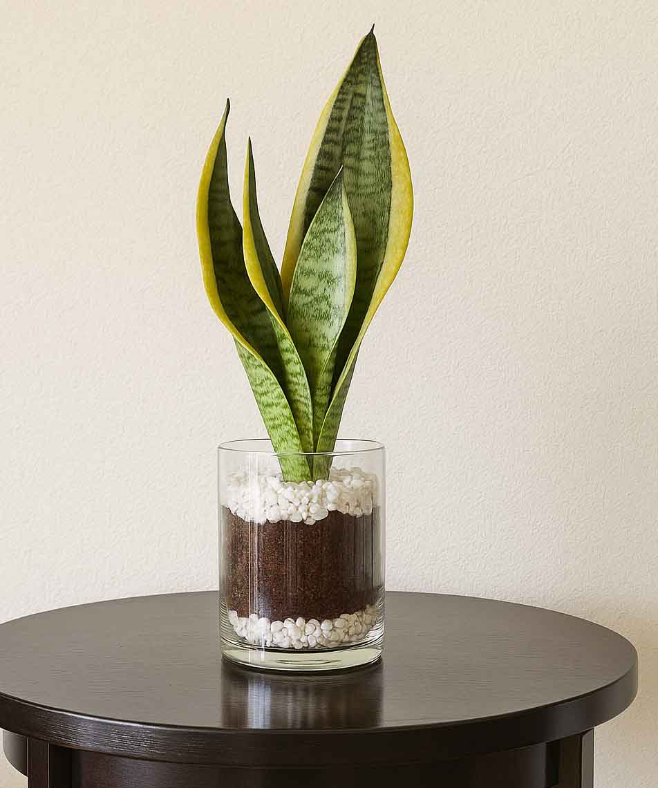This elegant snake plant, presented in a modern glass pot, adds a sleek and contemporary touch to any space.